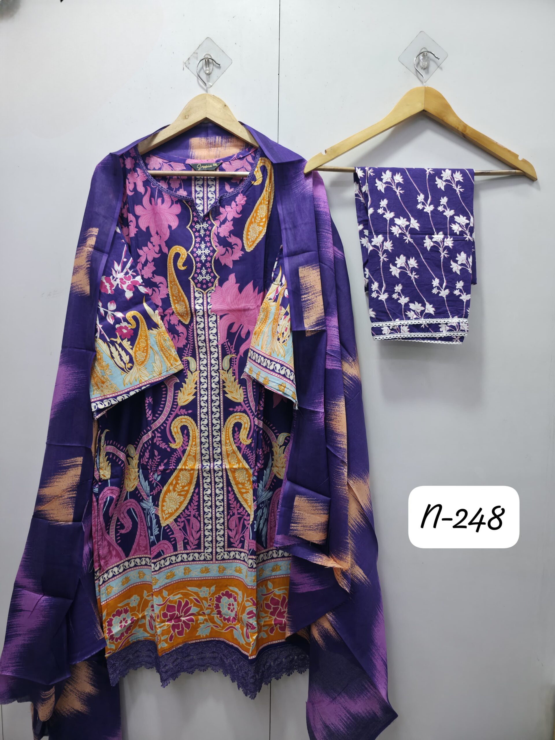 Fabric pure cotton stitch suit with lace work on daaman and neck