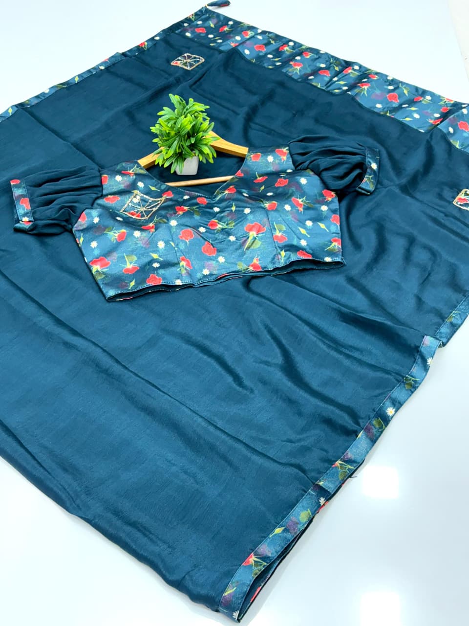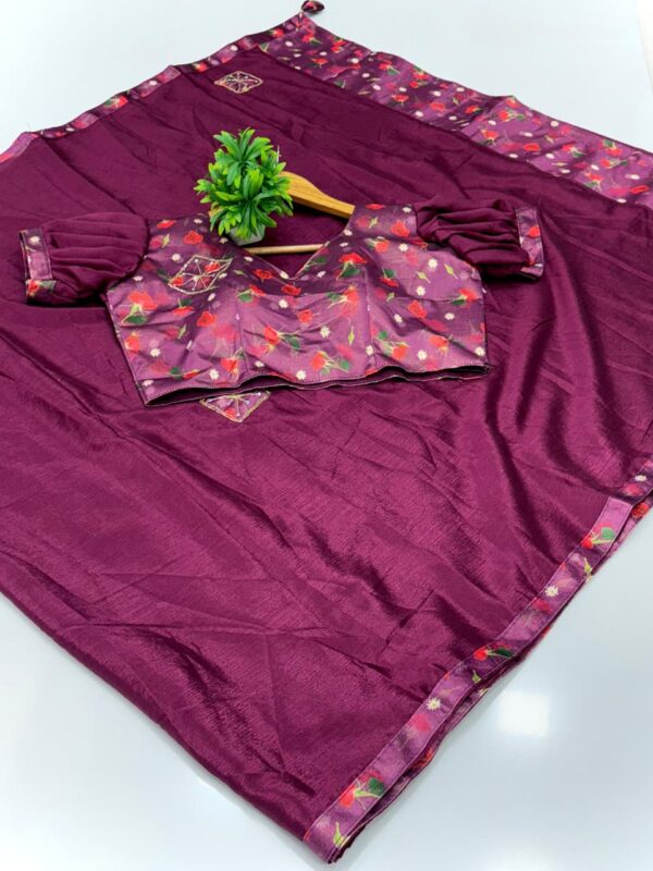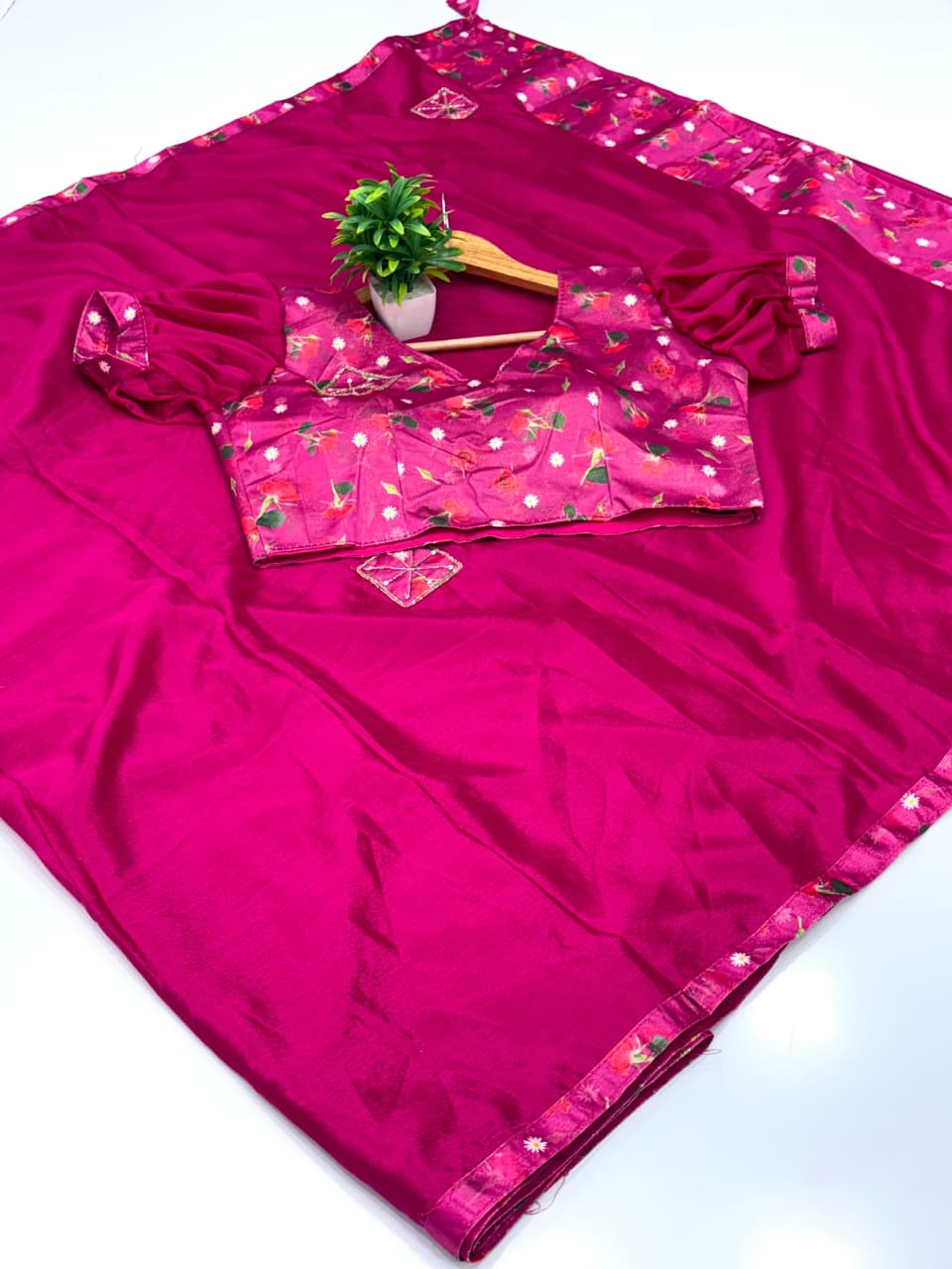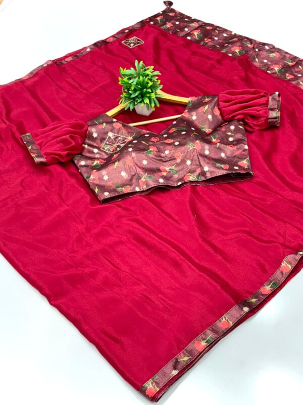 This is a beautiful maroon-red saree crafted in a smooth, lustrous fabric that gives a rich and elegant appeal. The body of the saree is plain, allowing the deep maroon shade to stand out gracefully. The border and pallu feature a contrasting floral design in shades of red, green, and white over a darker maroon base, adding a touch of charm and femininity.